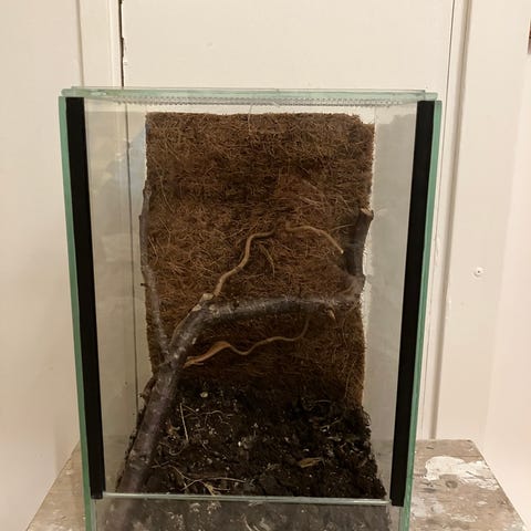 Litet terrarium i fint skick. Kokosmatta, ekologisk jord och ett par grenar i det idag, lätt att tömma och göra om då inget är limmat. Säljs som det står.