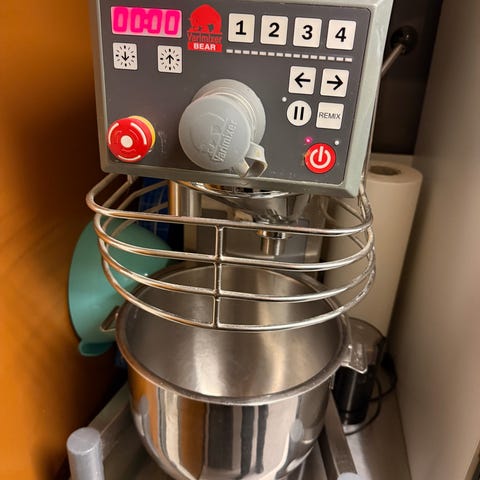 Maskinen är avsedd för blandning av deg och har en robust konstruktion för professionell användning i bagerier eller liknande verksamheter.