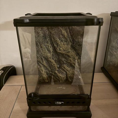 Litet terrarium i bra skick. 30 cm högt, 20 cm brett och 20 cm djupt. Kokosmatta, ormhassel och ekologisk jord i det idag. Lätta att ta bort och göra om som man vill ha det. Säljs som det står.
