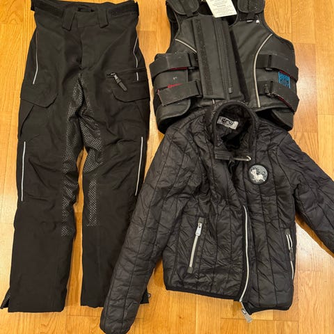 Ridbyxor och Jacka med skyddsväst och ridutrustning