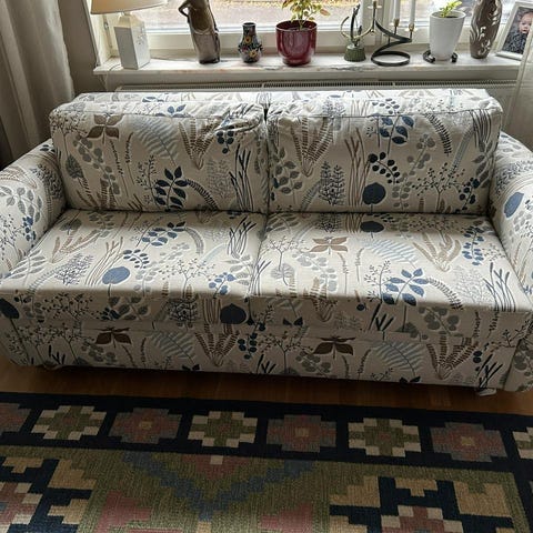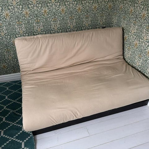 En riktigt fin design bäddsoffa. Lätt att bädda ner och helt okej att sova i. Svart underrede i trä. Grönt manchester tyg. Hel, ren och fräsch. Har mest stått oanvänd.