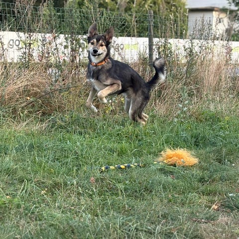 Vi har jobbat mycket med hundmöten och att kunna gå löst ute på promenader där han håller bra koll på en.