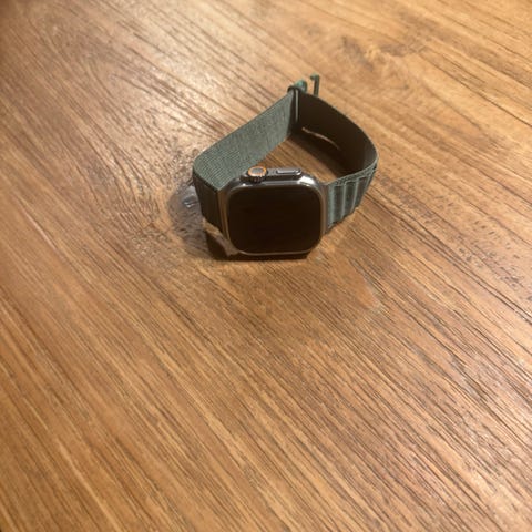 Apple Watch Ultra smartklocka med blått armband. Utrustad med avancerade sensorer och funktioner för hälsa och träning.
