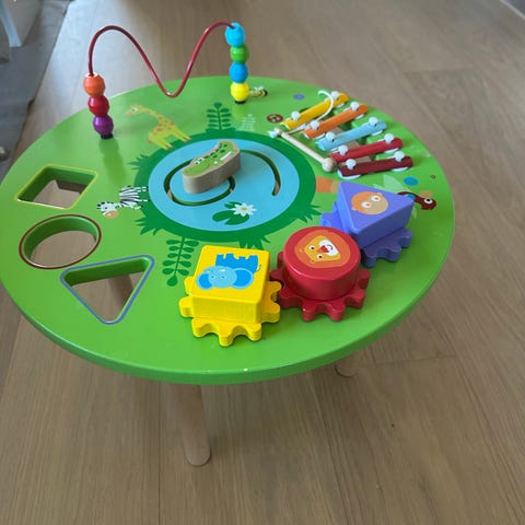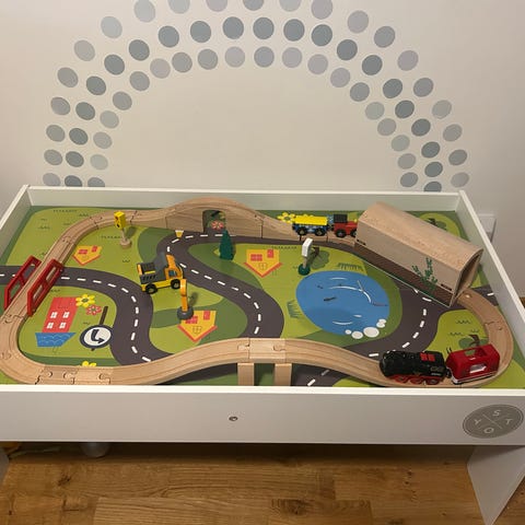 Tågbana med tillbehör. Lekbordet är väldigt smidigt dels för tågbana men också för byggande/lekande i allmänhet. Instruktion medföljer.