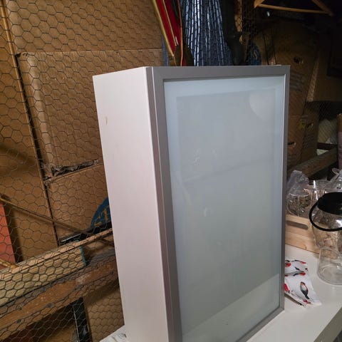 Två väggmonterade vitlackerade skåp från IKEA. Inuti finns två justerbara glashyllor för förvaring. Skåpet är lämpligt för kök eller badrum.