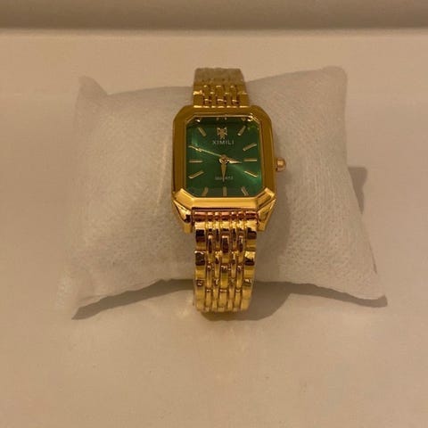 Ximili klocka för kvinna med guldfärgad metallarmband och rektangulär urtavla. Klockan har en klassisk design med tydliga visare och markeringar för timmar.