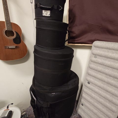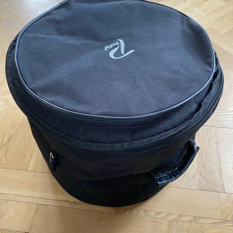 Afrikansk Djembetrumma med träkropp och snörning runt trumskinnet. Medföljer en svart bärväska med färgglada detaljer och axelremmar för enkel transport.