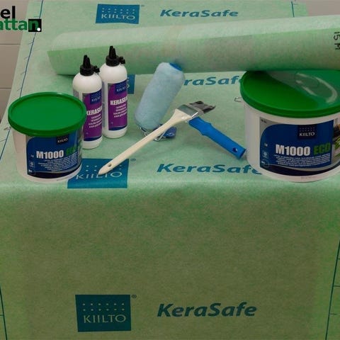 Kiilto KeraSafe tätskiktsfolie för användning i våtrum. Produkten är grönfärgad och utformad för att ge ett säkert skydd mot fukt vid kakel- och klinkerinstallationer.