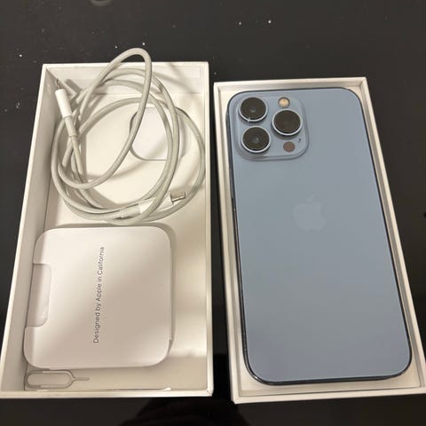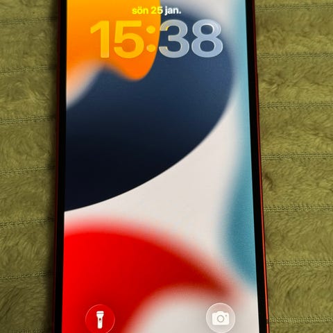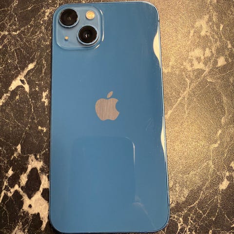 Apple iPhone 13 smartphone med 128 GB lagringskapacitet i blå färg. Enheten har en skärm med notch och dubbla kameror på baksidan. Batterikapaciteten är cirka 84 %. Operativsystemet är iOS, och telefonen är upplåst och klar för användning.
