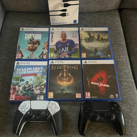 - PS5 hörlur (knappt använd) med USB-dongel samt ställ