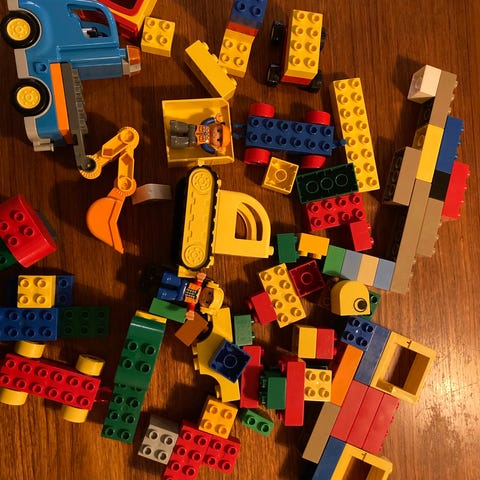 LEGO DUPLO byggklossar och fordon i olika färger och former. Setet innehåller bland annat klossar, traktor och ett tåg. Passar för yngre barn och är tillverkat av plast.