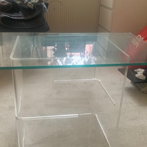 Säljer ett modernt och elegant soffbord med glasskiva i mycket fint skick. Den vita basen i kombination med glasskivan ger ett exklusivt och luftigt intryck som passar perfekt i ett stilrent vardagsrum.