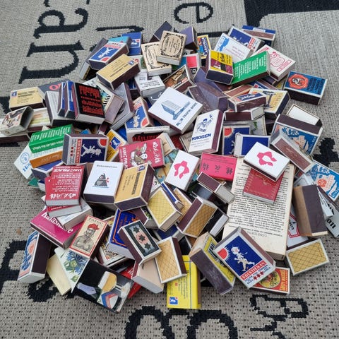 Samling av vintage tändsticksaskar med olika motiv och designer, tillverkade i Sverige. Askarna varierar i storlek och färg och visar klassiska illustrationer och branding från olika epoker.