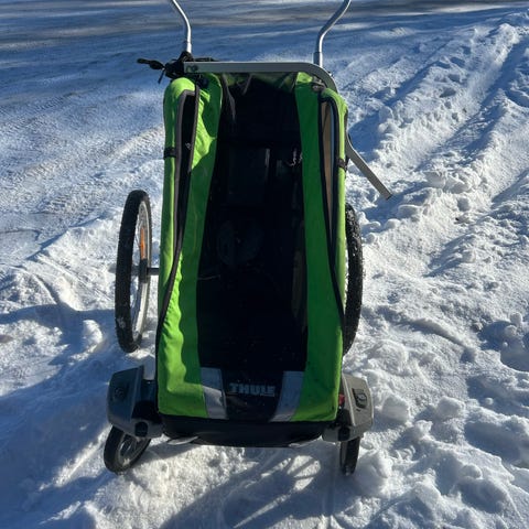 Spectra cykelvagn i blå och beige färg. Vagnen har två hjul, dragfäste för cykel och genomskinliga plastfönster framtill och på sidorna. Passar för transport av barn eller last bakom cykel. Konstruktion i metallram med tyg- och plastöverdrag. Cykelvagnen förvaras hopfälld när den inte används.