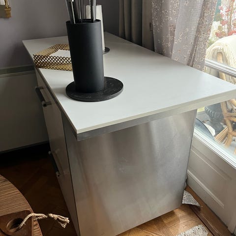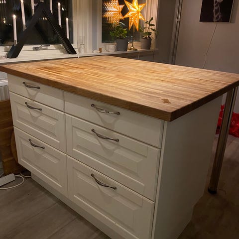 Köksskåp och bänkskiva i trä med förvaringslådo