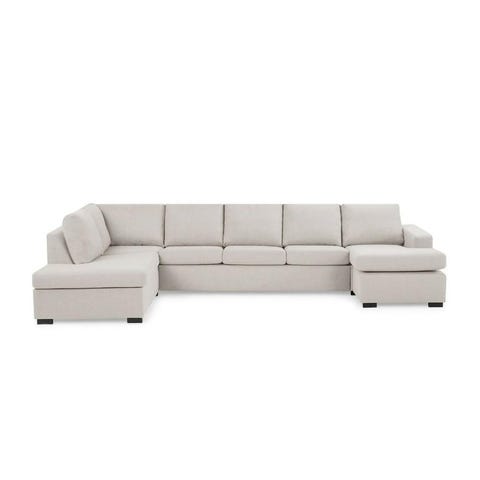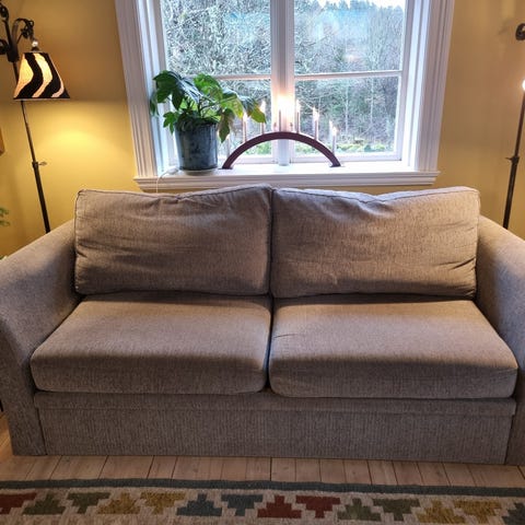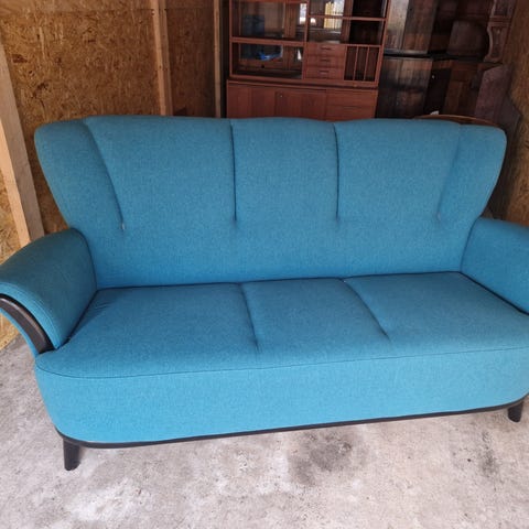 Stor och bekväm soffa i mörkgrå färg. Använd men i bra skick. Det finns en liten skada (bild 3) men inget påverkar funktionen. En fot i mitten saknas.