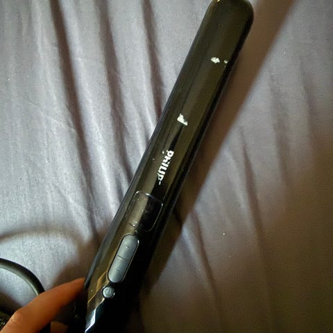 Plattång med inbyggd kam och tillhörande USB-kabel för laddning. Produkten är svart med rosa detaljer och avsedd för hårstyling