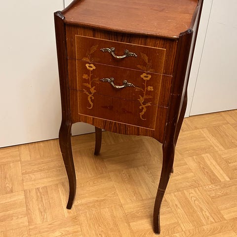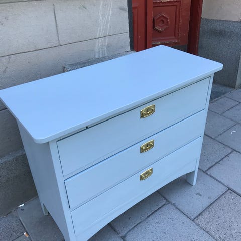 En äldre fin byrå i ommålad trä. Svart med mässing handtag. Lite mindre i storleken men rymmer massor, passar fint som sängbord/ nattduksbord , i hallen eller som lampbord/ avlastningsbord vid soffan.