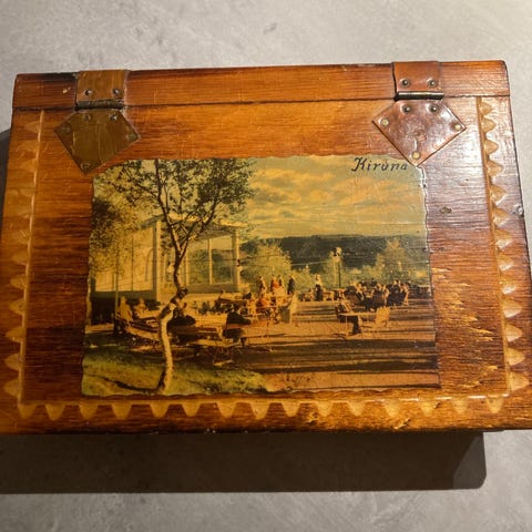 Träask med handmålad blomdekoration i flera färger på mörkblå bakgrund. Asken har flera fack inuti för förvaring och är tillverkad i trä. Den är lämplig för att förvara småsaker och har en dekorativ design.