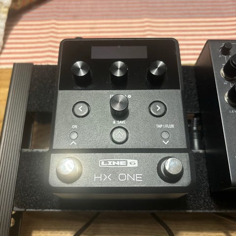 Line 6 POD gitarrtillbehör med flera reglage och en digital display för justering av ljud och effekter. Enheten har anslutningar för MIDI och nätverk samt rattar för bas, diskant, mellanregister, reverb och volym.