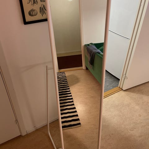 IKEA Golvstående spegel i vit färg. Spegeln har en smal och hög design med ram i vitt material. Passar för användning i sovrum eller hall för att se hela kroppen.