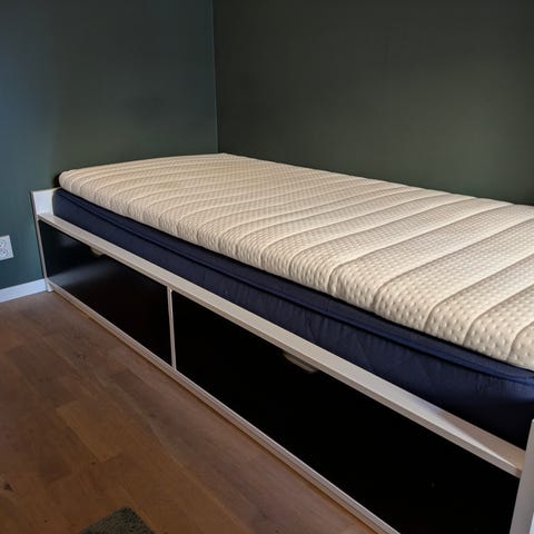 Mycket fin säng, 80x200, 65 cm hög, går att lyfta för att ha förvaring under