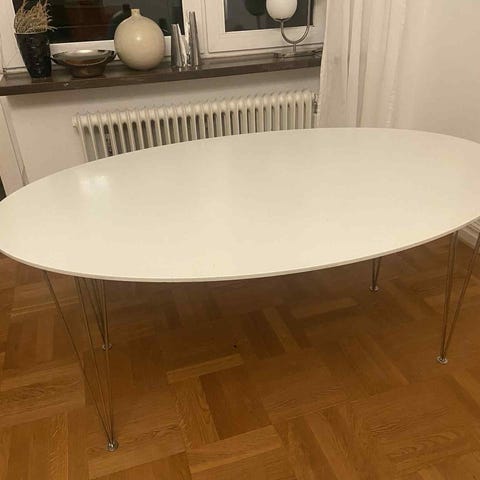 Säljer ett stabilt och rymligt ovalt matbord med vit laminatskiva och träkant i ljust träslag. Kromade ben och gott om plats runt bordet – rymmer ca 8 personer.