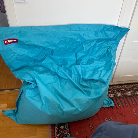 Finns två remmar med karbinhakar på som man kan fästa i hålen på sidorna, för att få den mer som en fåtölj.