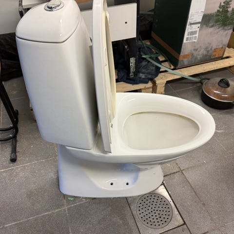 Toalettstol i vitt porslin, spolknapp med plats för doftstav. Isolerad vattencistern.