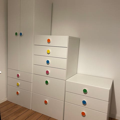 IKEA STUVA barnmöbel garderob med spegel och flera lådor. Garderoben har en grön och blå färgkombination och är anpassad för barnrum. Den har plats för kläder och förvaring .