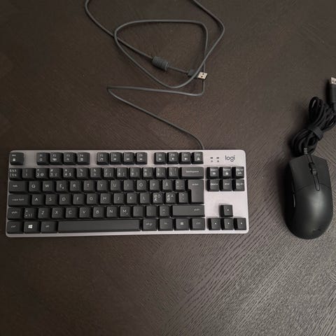 Logitech tangentbord och möss set inklusive hörlurar. Setet består av ett svart tangentbord med numeriskt tangentbord, en svart mus och ett par över-ear hörlurar med mikrofon och justerbar huvudband.