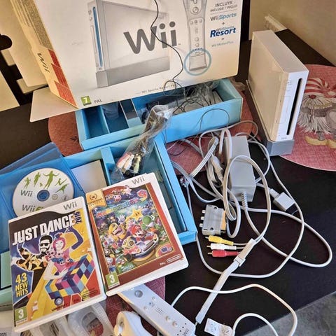 Nintendo Wii spelkonsol i vitt utförande inklusive en handkontroll. Konsolen har en kompakt design med frontmonterad skivspelare och anslutningar för ström och bild. Handkontrollen är vit med inbyggd pekskärm och knappar för spelkontroll. Väll använd har inte använt den på 3-4 år och allt ska funka med den har tyvärr inga spel som med följer.
