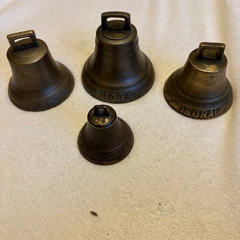 mässingsklocka gjuten i Mora, med text: