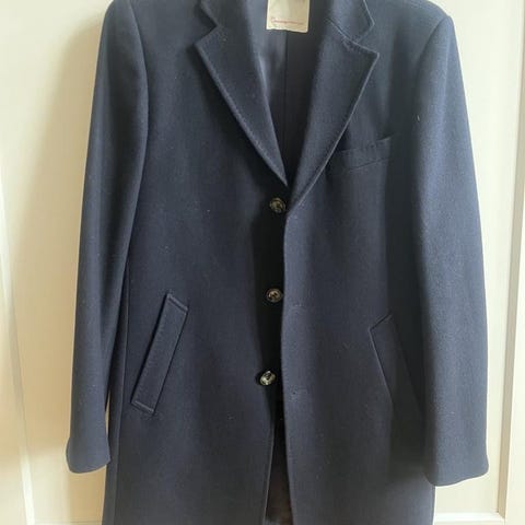 Supefin herrock, enkelknäppt, från Rice. Storlek 48. Yttertyg i blandning av kammad bommul och ull. Smala slag och två sidofickor med lock.