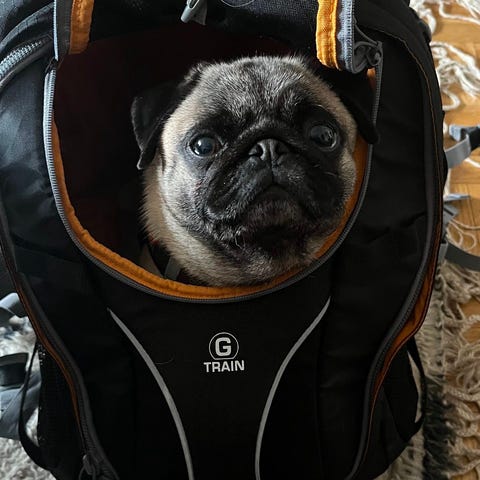 Ryggsäck för husdjur i grå färg med mjukt foder. Utrustad med vadderade axelremmar och nätfickor på sidorna för extra förvaring. Designad för att bära små husdjur bekvämt och säkert.