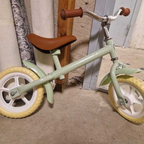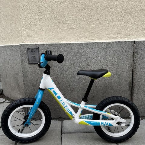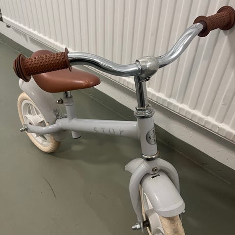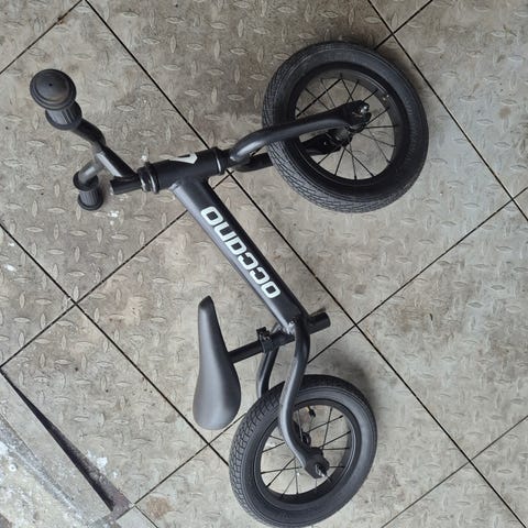 Balanscykel för barn i silver med svarta hjul och sadel. Cykeln är utformad för att hjälpa barn att utveckla balans och koordination innan de lär sig cykla med trampor.
