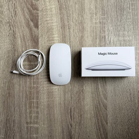 Apple Magic Mouse trådlös mus i vit färg. Musen har en slät, låg profil och är designad för att användas trådlöst. Passar för generell datoranvändning och navigering.