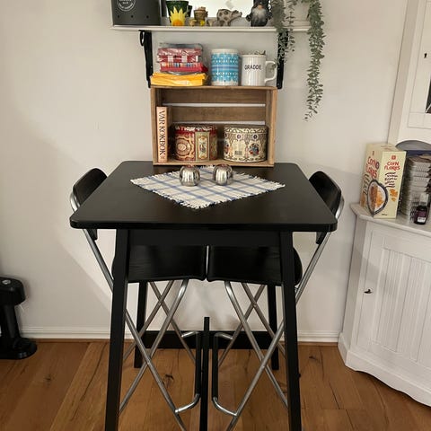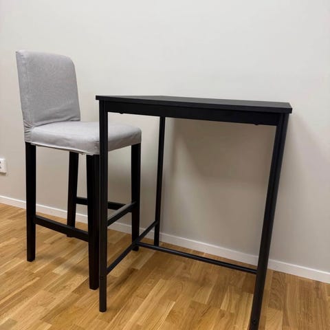 IKEA barbord Sandeberg (nypris 499kr) med två svarta barstolar Dalfred ( nypris 495kr/st) Bordet är fyrkantigt med en svart yta och metallram. Barstolarna är justerbara i höjd och har en rund sits med fotstöd. Hämtas hos säljaren.
