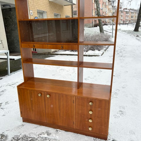 Har en vintage bokhylla i teak från föräldrahemmet, 1960-tal, 1970-tal av designern Gillis Lundberg för IKEA.