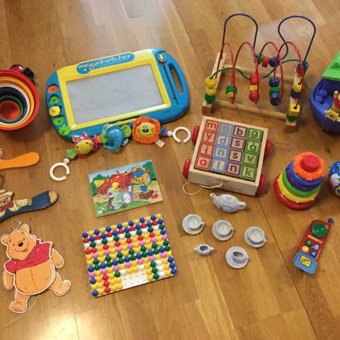 Plockhink transparant innehåller 12 klossar i olika färger och former. Att stoppa ner dem i hinken är både roligt och bra träning för de yngre barnen.