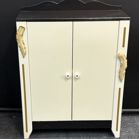 Röd lackad byrå med två lådor och ett skåp med hylla. Byrån har metallhandtag och gångjärn. Möbeln är tillverkad lackad spånskiva och lådor i trä. Är lämplig för förvaring eller som mediamöbel. Märket Voice Azzaro från Sverige av hög kvalitet, som inte tillverkas idag.