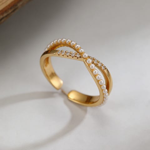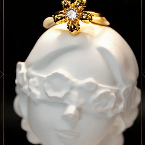 En vacker ring i guldton med en detaljerad blomdesign och gnistrande kristaller. Perfekt för att addera en touch av elegans till din stil.