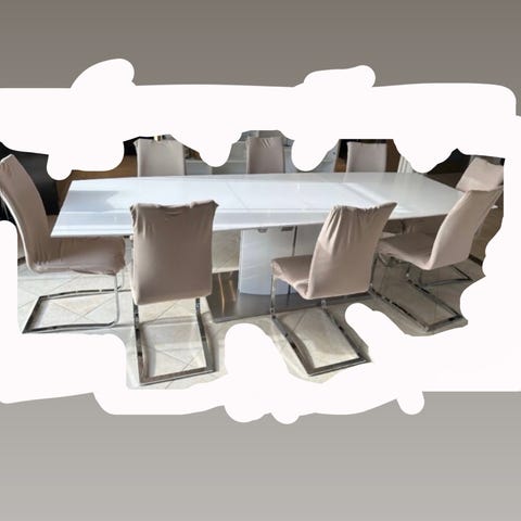 Stort vitt matbord, köpt på Stalands, säljes. 170 cm utan iläggsskivor. 2 skivor medföljer, 50 cm st. Kan alltså bli 270 långt. 1 m brett på bredaste stället.