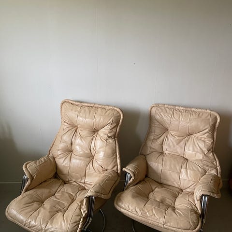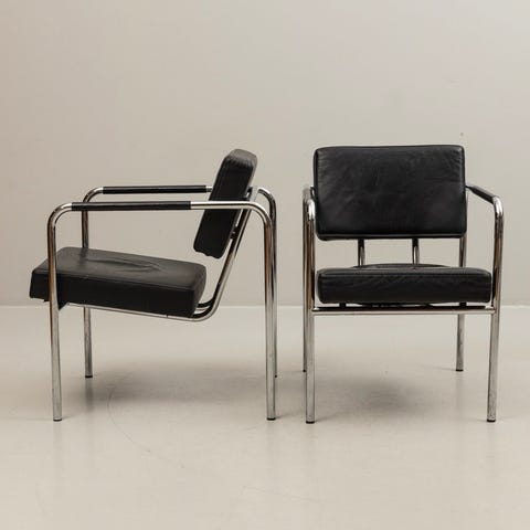 JOHN MORTENSEN, fåtölj, Fuga, låg, stomme av förkromade stålrör, bärväv av canvas, plymåer klädda i svart skinn, 1970-tal, Thams Möbler, Danmark. Använda och spår av användning men mycket bekväma och snygga