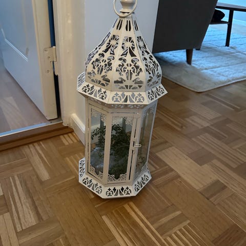 Modern lykta med hålmönster och handtag. I bambu med ljushållare inuti. Lika snygg inne som ute. Mått: 28 x 28 x 36 cm.