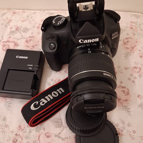 Helt ny ouppackad Canon EOS 1000D systemkamera med standardobjektiv.
