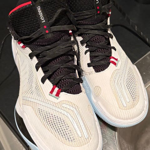 Puma basketballskor i blå färg, storlek 42. Skorna har en unik design med detaljer i vitt och är avsedda för basketspel.