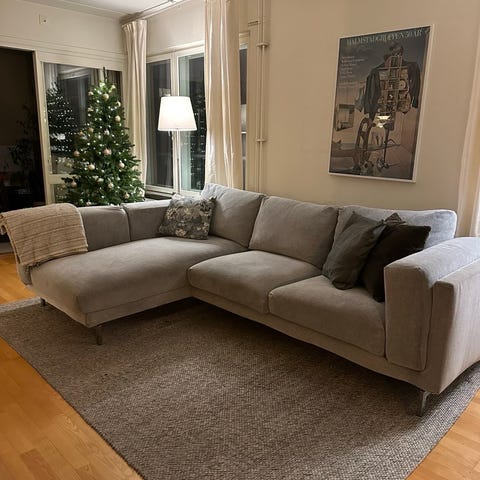 Fantastiskt skön soffa som varit favoriten hemma i flera år. Nu är den för stor och fick vika hädan för en nättare modell. Det finns tydligt slitage på nån sittdyna som synes på bilden samt så blev den tyvärr lite skavd på några ställen vid flytten. Se det som en fin deal på en toppenbra soffa som har mycket kvar å ge. Skavankerna kommer på köpet och påverkar absolut inte komforten å väl på plats kommer de inte synas nämnvärt.