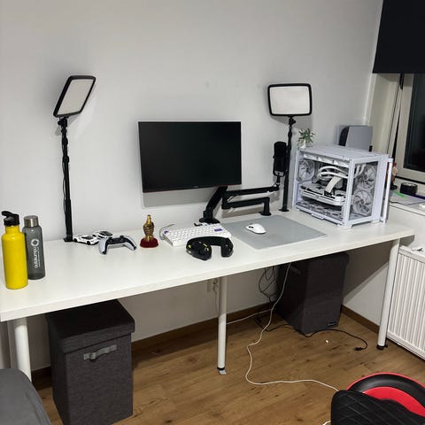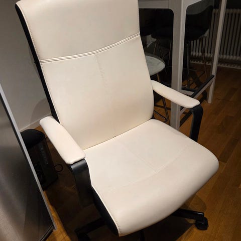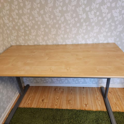 IKEA skrivbord med vit skiva och metallben. Bordet har en enkel och funktionell design som passar för kontors- eller hemmabruk. Storleken och materialet gör det lämpligt för olika arbetsytor och användningsområden.