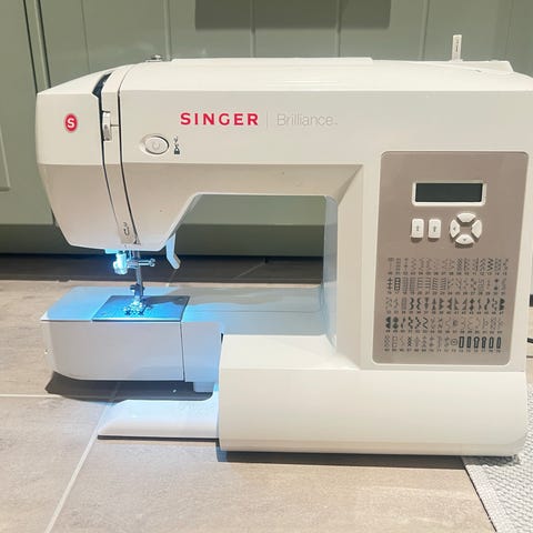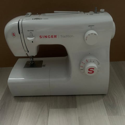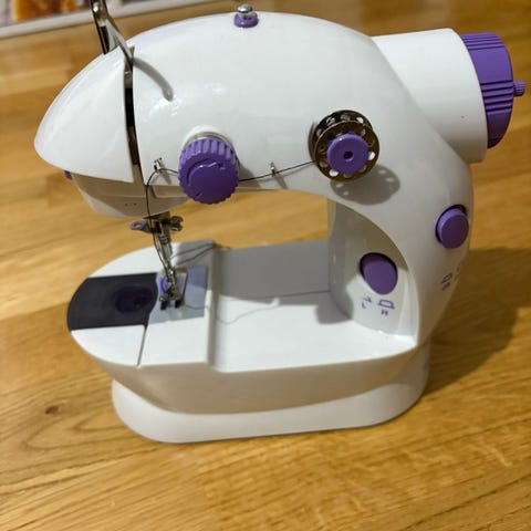 Singer Mini symaskin i vitt och lila med strömadapter och bruksanvisning. Kompakt design lämplig för små sömnadsprojekt och enklare lagningar.